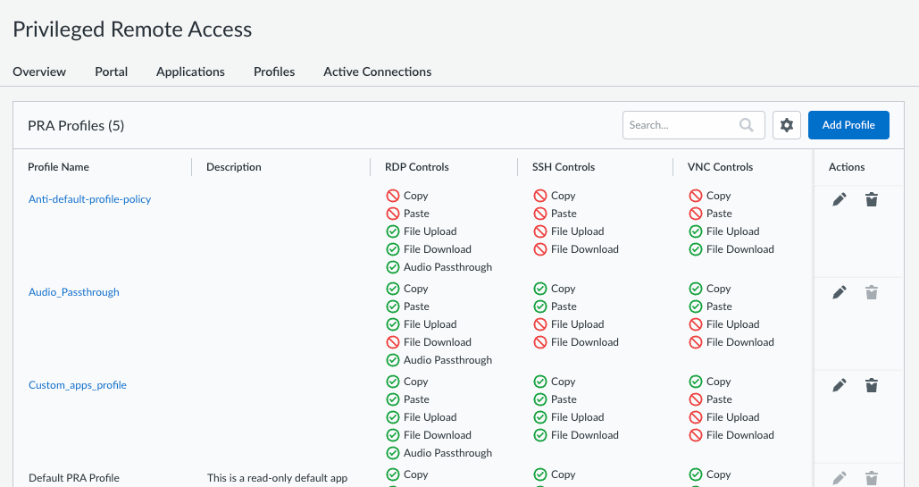 You can view the list of profiles on the PRA Profiles table. By default, PRA provides a read-only profile (Default PRA Profile) that defines the actions a user can perform when using any apps that are defined in a PRA policy or any user-defined RDP, SSH, or VNC apps that you don't manage.
