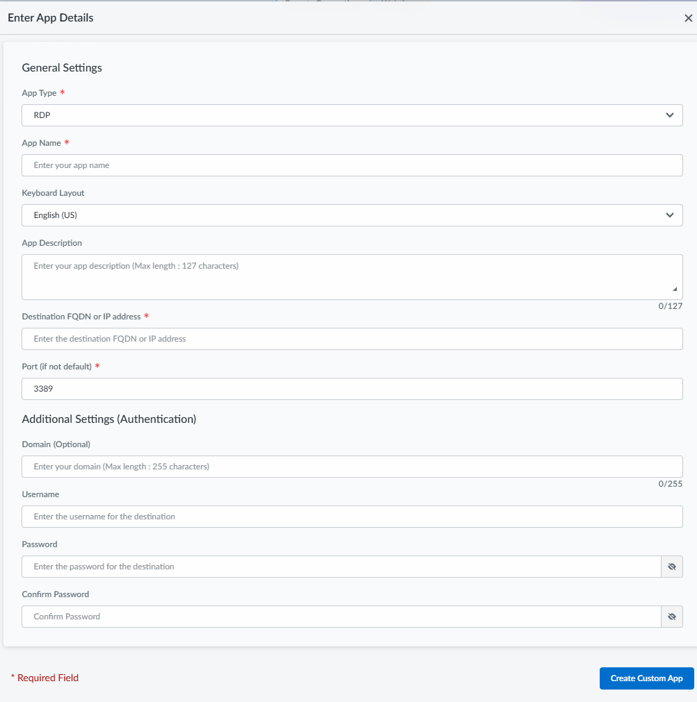 Enter the general details for the app:- Select App TypeRDP.Enter the App Name.(Optional) Select a Keyboard Layout to use for the remote RDP app.(Optional) Enter an App Description.Enter the Destination or FQDN or IP address of the app.Enter the Port to use for the app, if different from the default port.You can enter only one port between 1-65535. (Default: 3389)