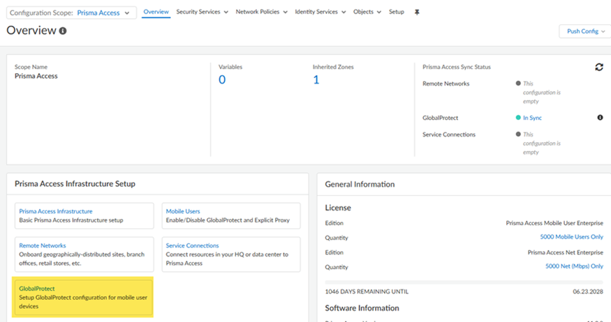 - Go to ConfigurationNGFW and Prisma Access, select the Prisma Access configuration scope, and select GlobalProtect.
