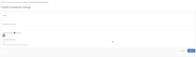 Give the Connector Group a Name and provide a Description for it.Enable Preserve User ID only if you have a Palo Alto Networks firewall between your ZTNA Connector and the data center application servers. If you enable this option, you need to configure the firewall. You can't do any modifications after you have created the Connector Group.