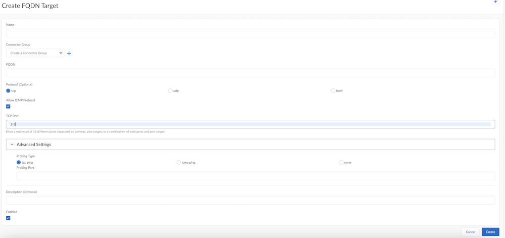 FQDN Targets—to create a target for a single FQDN, create an FQDN target.Starting with Prisma Access 5.0, for Connector groups having 5.0 or higher ZTNA Connector version, if an application FQDN resolves to multiple private IP addresses, the ZTNA connector performs an application probe to determine the status of all resolved IP addresses and load balances the FQDN access to multiple resolved IP addresses that have an application status of Up.To create an FQDN target, go to FQDN Targets and Create FQDN Target. You create an FQDN target the same as you create an FQDN wildcard, substituting the FQDN wildcard with a single FQDN.Starting with Prisma Access 5.0.1, you can select multiple connector groups per FQDN target as well as wildcard targets, up to a maximum of four connector groups per FQDN or wildcard targets. Use the guidelines when configuring multiple connector groups per target.Applications that are discovered as the result of a wildcard target also display here. When users access sites that match the wildcard, those apps are automatically onboarded for access from ZTNA Connector for your mobile users and remote network users. For example, given a wildcard of *.example.com, when users access the app at app1.example.com, ZTNA Connector automatically adds that app to the list of FQDN targets.After an FQDN application is discovered from a parent wildcard target, any changes to the wildcard target are not updated in the discovered application. In addition, the same discovered FQDN is not rediscovered. If the characteristics for the discovered FQDN application require updating, perform a manual update on the discovered application using these steps.