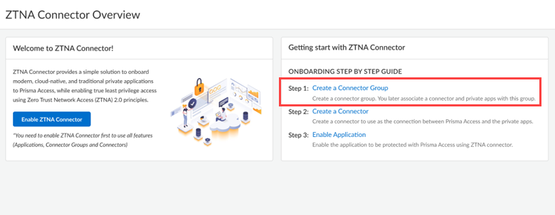After you Enable ZTNA Connector you can begin setting up the ZTNA Connector components: