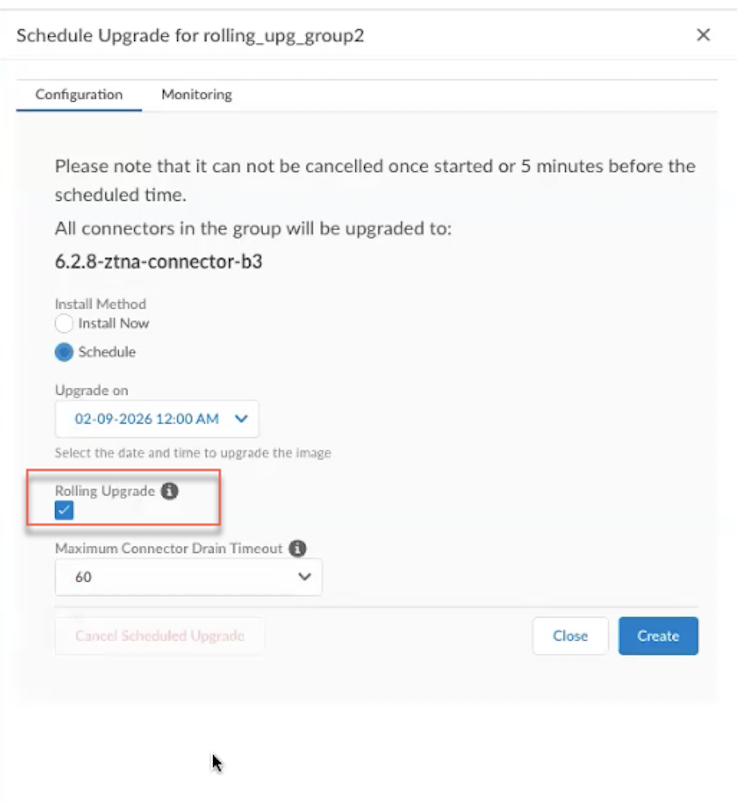 (Optional) To upgrade the Connector Group serially, you can use a rolling upgrade.During a rolling upgrade, Prisma Access upgrades each Connector in a Connector Group individually rather than simultaneously. When the upgrade begins, ZTNA Connector is put in a quiesce mode accepting no new sessions. Then Prisma Access drains the Connector, which prevents it from accepting new sessions. To maintain continuous application access, Prisma Access forwards new client sessions to the remaining Connectors in the Connector Group. When the Connector has no active sessions or the drain timeout is reached, the Connector is then upgraded. When the Connector upgrade is completed, the same sequence of steps is applied to the next Connector until the Connector Group rolling upgrade is completed.