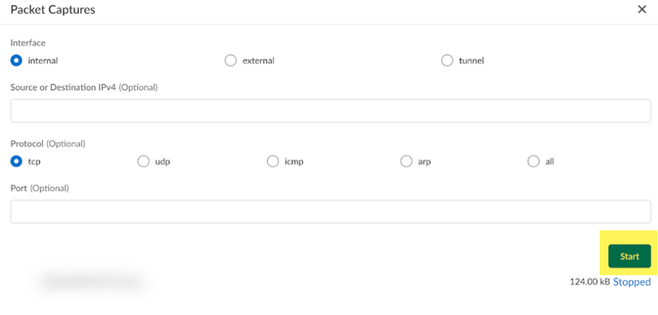 Select the interface where the packets will be captured (internal, external, or tunnel.(Optional) Specify the Source or Destination IPv4 address from which packets are captured.If you specify this option, only packets from this IP address are captured.(Optional) Select the type of packets to capture.You can select packets of a specific protocol to be captured (tcp, udp, icmp, or arp), or select all to capture all packets.(Optional) Select a Port from which packets will be captured.If you specify this option, only packets from this port are captured.Start the packet captures.