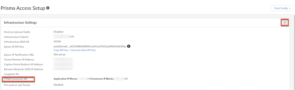 - Go to ConfigurationNGFW and Prisma AccessPrisma Access InfrastructureInfrastructure Settings and click the gear to edit the Settings.
