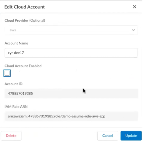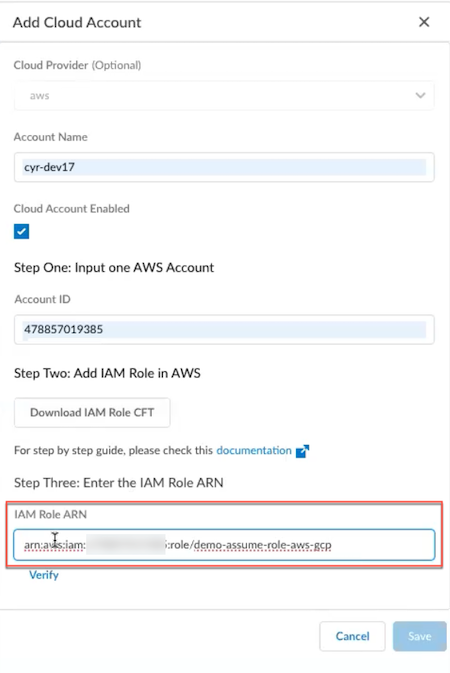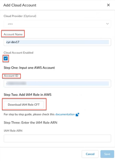 Complete the following steps to add a cloud account, an IAM role in AWS, and discover