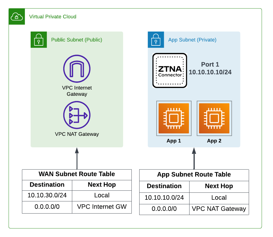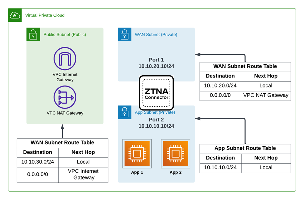 The following diagram shows a sample ZTNA Connector deployment in AWS using two-arm mode