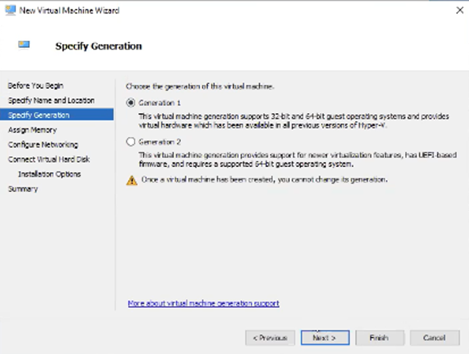 - Create a Connector Group and a Connector for the Hyper-V VM.Select ConfigurationZTNA ConnectorConnectors, and find the connector you created for the Hyper-V VM, Copy Token in the Status area, and copy the Key and Secret values.![]() Upload the vhd image you downloaded from the CSP to the Hyper-V VM.Make sure that the location you choose is reachable from the Hyper-V VM.One (vhd) file is required for each Hyper-V VM.Go to Hyper-V Manager and create a new virtual machine by selecting ActionsNewVirtual Machine.This workflow shows the steps you perform to deploy Hyper-V VMs in a Microsoft server. The Hyper-V UI might look different in your environment. Upload the vhd image you downloaded from the CSP to the Hyper-V VM.Make sure that the location you choose is reachable from the Hyper-V VM.One (vhd) file is required for each Hyper-V VM.Go to Hyper-V Manager and create a new virtual machine by selecting ActionsNewVirtual Machine.This workflow shows the steps you perform to deploy Hyper-V VMs in a Microsoft server. The Hyper-V UI might look different in your environment.![]() Go to the Next screen and enter a unique name for the VM and go to the Next page.(Optional) To change the location of the VM, select Store the virtual machine in a different location and select the location. Go to the Next screen and enter a unique name for the VM and go to the Next page.(Optional) To change the location of the VM, select Store the virtual machine in a different location and select the location.![]() Select Generation 1 as the VM generation and go to the Next page.This is the generation that the ZTNA Connector vhd file supports. Select Generation 1 as the VM generation and go to the Next page.This is the generation that the ZTNA Connector vhd file supports.![]() Assign memory to the VM.Allocate a minimum memory of 8192 MB (8 GB), which meets the minimum requirements for a Hyper-V VM and go to the Next page. Assign memory to the VM.Allocate a minimum memory of 8192 MB (8 GB), which meets the minimum requirements for a Hyper-V VM and go to the Next page.![]() Configure networking for your VM; then, go to the Next page.The networking you use depends on your configuration. This example uses a NAT Switch for the networking. Configure networking for your VM; then, go to the Next page.The networking you use depends on your configuration. This example uses a NAT Switch for the networking.![]() Connect the virtual hard disk. Connect the virtual hard disk.- Select Use an existing virtual hard disk and Browse for the vhd file you downloadedSelect the vhd file you downloaded the Open it; then, go to the Next page.![]() Finish the new VM wizard. Finish the new VM wizard.![]() Hyper-V creates the VM.Make sure that your VM has at least four processors by going to the Processor area and making sure that you select at least 4 virtual processors. Hyper-V creates the VM.Make sure that your VM has at least four processors by going to the Processor area and making sure that you select at least 4 virtual processors.![]() Start the VM. Start the VM.![]() Connect to the serial console. Connect to the serial console.![]() Wait for the interactive CLI install program initializes, then Configure the ION model, key, and secret. Wait for the interactive CLI install program initializes, then Configure the ION model, key, and secret.- Select 1 (an ION Model of ion 200v) from the choices that display.Select an ION model: 1) ion 200v 2) ion 3102v 3) ion 3104v 4) ion 3108v 5) ion 7108v 6) ion 7116v 7) ion 7132v 8) ion 9100v Choose a Number or (Q)uit: 1 CPU: Passed (needed 4) Memory: Passed (needed 8.0G) Disk: Could not verify (needs 40.0G) Network: Passed (needed 1) Select an item to modify, or submit config: 1) Model : ion 200v 2) ION Key : 3) Secret Key : 4) Controller 1 : Controller - DHCP 5) Port 1 : Disabled/Unused 6) Port 2 : Disabled/Unused 7) Port 3 : Disabled/Unused 8) Port 4 : Disabled/Unused 9) Port 5 : Disabled/Unused 10) Port 6 : Disabled/Unused 11) Port 7 : Disabled/Unused 12) Port 8 : Disabled/Unused 13) Port 9 : Disabled/Unused 14) Submit and restartInput the Key from the connector by selecting option 2 and entering the key you saved from the ZTNA Connector UI.Choose a Number or (Q)uit: 2 Enter ION Key[None]: xxxxxxxxxx-yyyyyyyy-zzz-1234-1234-abcdefghijkl Select an item to modify, or submit config: 1) Model : ion 200v 2) ION Key : xxxxxxxxx-yyyyyyyy-zzz-1234-1234-abcdefghijkl 3) Secret Key : 4) Controller 1 : Controller - DHCP 5) Port 1 : Disabled/Unused 6) Port 2 : Disabled/Unused 7) Port 3 : Disabled/Unused 8) Port 4 : Disabled/Unused 9) Port 5 : Disabled/Unused 10) Port 6 : Disabled/Unused 11) Port 7 : Disabled/Unused 12) Port 8 : Disabled/Unused 13) Port 9 : Disabled/Unused 14) Submit and restartEnter the ZTNA Connector secret by selecting option 3 and entering the secret you saved from the ZTNA Connector UI.Choose a Number or (Q)uit: 3 Enter ION secret[None]: abcde12345 Select an item to modify, or submit config: 1) Model : ion 200v 2) ION Key : xxxxxxxxx-yyyyyyyy-zzz-1234-1234-abcdefghijkl 3) Secret Key : abcde12345 4) Controller 1 : Controller - DHCP 5) Port 1 : Disabled/Unused 6) Port 2 : Disabled/Unused 7) Port 3 : Disabled/Unused 8) Port 4 : Disabled/Unused 9) Port 5 : Disabled/Unused 10) Port 6 : Disabled/Unused 11) Port 7 : Disabled/Unused 12) Port 8 : Disabled/Unused 13) Port 9 : Disabled/Unused 14) Submit and restartConfigure WAN port options.- Select option 5 (Port 1).Choose a Number or (Q)uit: 5 Port 1: 1) Role : Disable 2) Cancel Port changes 3) Apply and returnSelect option 1 (Public/WAN).Choose a Number or (Q)uit: 1 Select Port Role: 1) Internet facing port (PublicWAN) 2) Private WAN port (PrivateWAN) 3) Bypass Port Pair 1 (WAN Port) 4) Bypass Port Pair 1 (LAN Port) 5) Bypass Port Pair 2 (WAN Port) 6) Bypass Port Pair 2 (LAN Port) 7) Bypass Port Pair 3 (WAN Port) 8) Bypass Port Pair 3 (LAN Port) 9) Bypass Port Pair 4 (WAN Port) 10) Bypass Port Pair 4 (LAN Port) 11) Disabled/Unused(Optional) If you need 