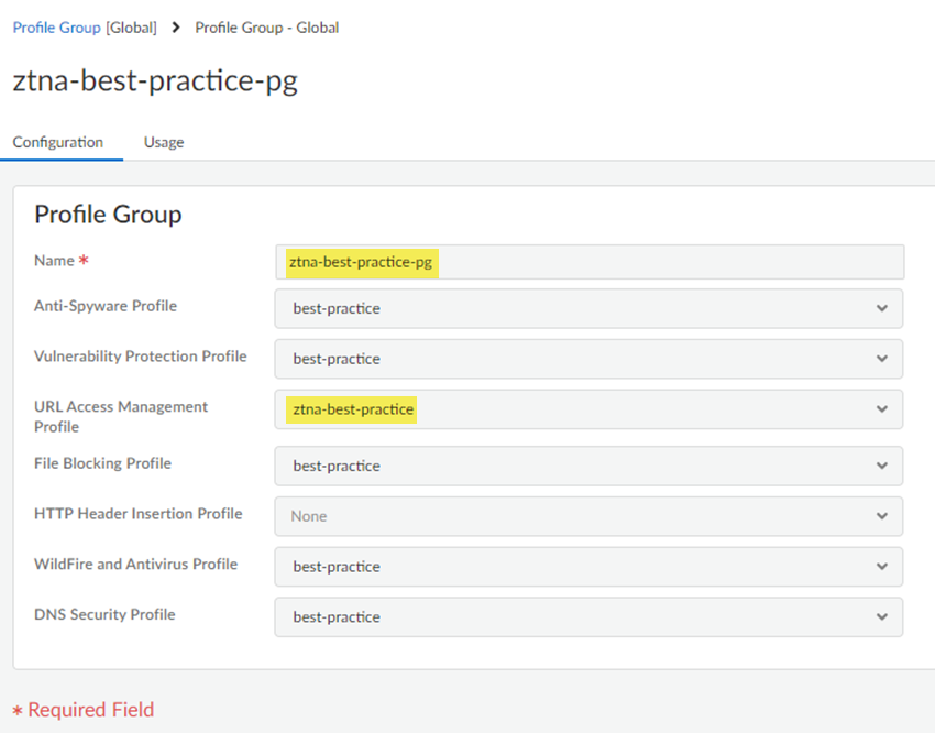 Create a profile group and attach the URL Access Management Profile to the group.- Go to ConfigurationNGFW and Prisma AccessSecurity ServicesProfile Groups.Add a profile group, specifying the URL Access Management Profile you created.