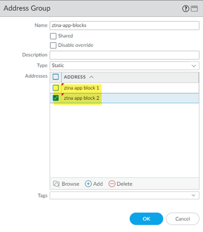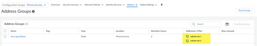 Go to ConfigurationNGFW and Prisma AccessObjectsAddressAddress Groups and Add the addresses you created to the address groups.