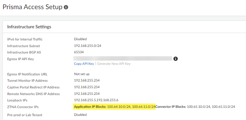 - From the ZTNA Connector UI, go to ConfigurationNGFW and Prisma AccessConfiguration ScopePrisma AccessPrisma Access Infrastructure SetupPrisma Access Infrastructure and make a note of the Application IP Blocks under ZTNA Connector IPs.