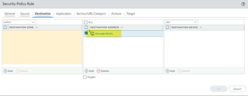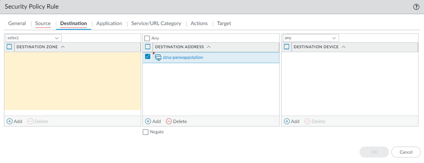 If you have added targets based on FQDNs (SettingsZTNA ConnectorConnectorsApplication TargetsFQDN Targets), create an address object and a Security policy to allow access to the apps by completing the following steps. - Configure a Security policy for the apps that you added using FQDNs.