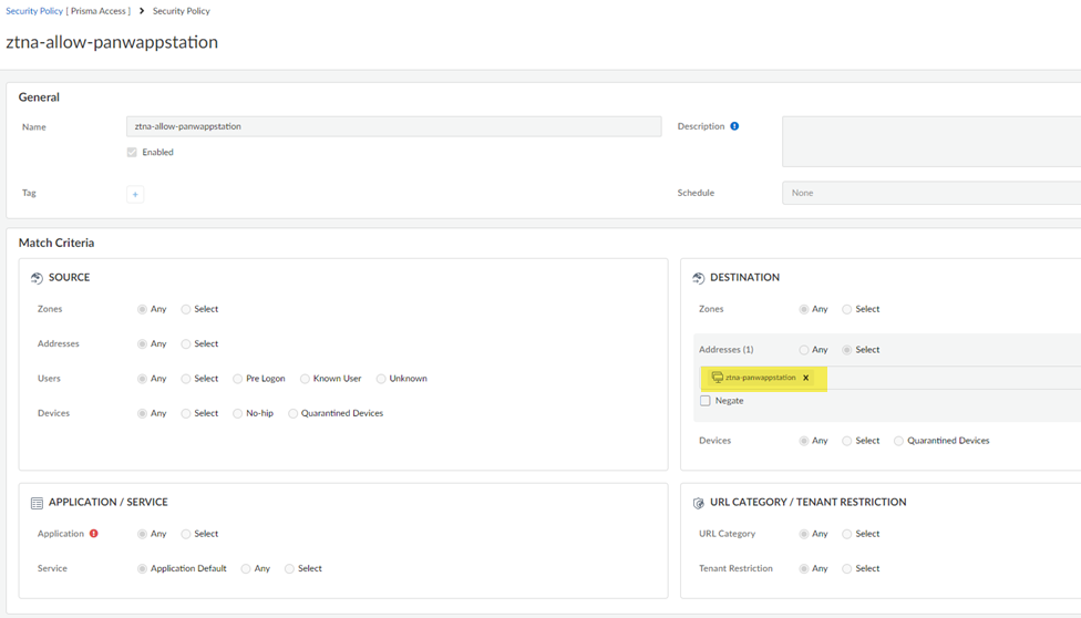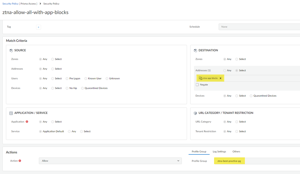 Create a policy to allow the profile group and the IP addresses for the ZTNA Connector Application IP Blocks.- Go to ConfigurationNGFW and Prisma AccessConfiguration ScopePrisma AccessPrisma Access Infrastructure and make a note of the Application IP Blocks under ZTNA Connector IPs.