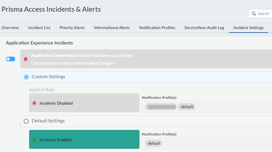 In Strata Cloud Manager, select IncidentsPrisma AccessIncident Settings to view the Incident Settings page. From this
