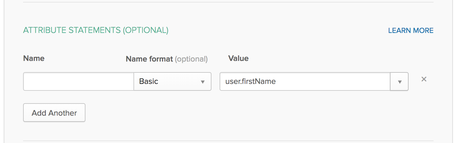 In the ATTRIBUTE STATEMENTS (OPTIONAL) area, specify users, Name formats, and values in Okta Expression Language.These fields reference, transform and combine attributes to define the Username attribute format to match what you set up on Prisma Access. For example, specify a name format of Basic and a Value of user.firstName.