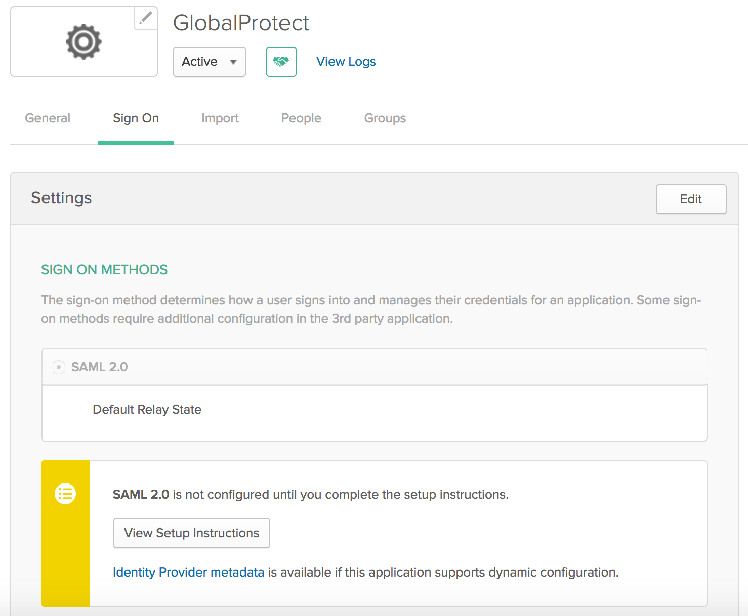Optionally, in the Group Attribute Statements (Optional) area, create group attribute options.You can’t use group information that’s retrieved from the SAML assertion in either security policy rules or the GlobalProtect app configuration.Save the configuration.Complete the configuration of the SAML 2.0 web application in Okta and enable the users to use the application. Click View Setup Instructions for details.To download the metadata files for the portal and gateways, click Identity Provider metadata and copy that information.
