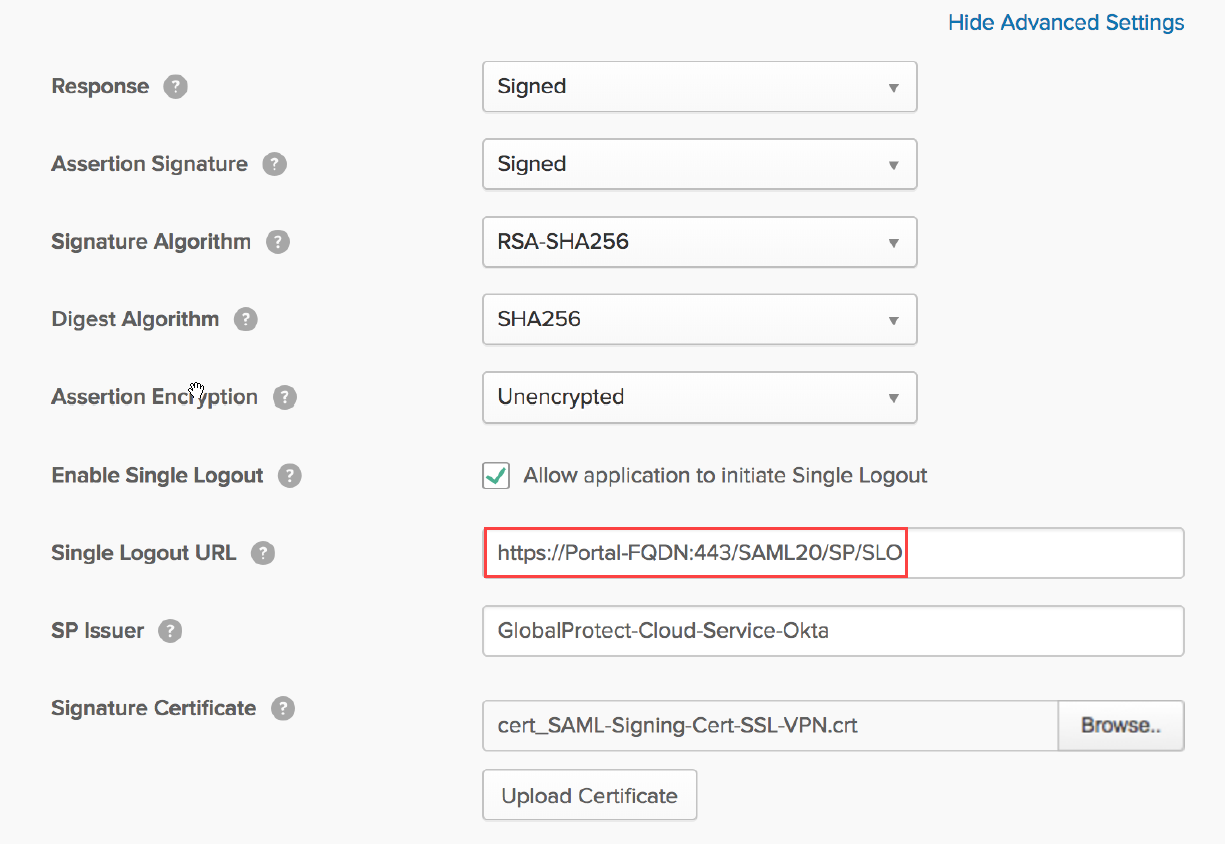 - Single Logout URL—Enter https://<Prisma Access-FQDN>:443/SAML20/SP/SLOWhere <Prisma-Access-FQDN> is the FQDN you defined for Prisma Access when you set up the environment.