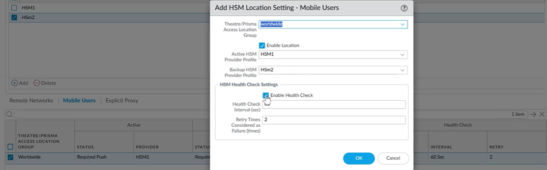 - Configure the HSM Location Setting for each service. The system pushes your configurations to the firewalls provisioned in these location settings, or regions.Click the check box in the Theatre/Prisma Access Location Group column for the service you want to configure. Theatres and Prisma Access Locations you can use are Worldwide; North America & South America; Africa, Europe & Middle East, and Asia, Australia & Japan.