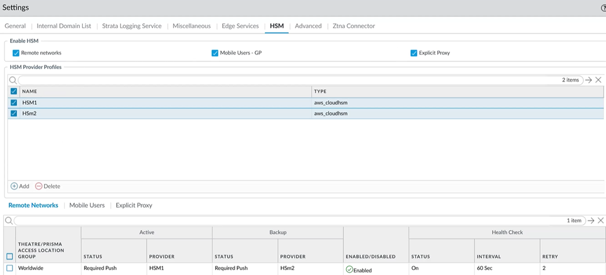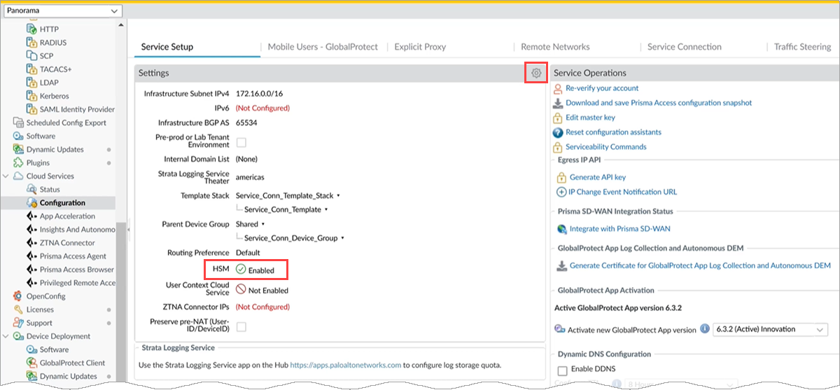 - Go to ConfigurationNGFW and Prisma AccessConfiguration ScopePrisma AccessPrisma Access InfrastructurePrisma Access SetupHSM Settings and select the gear icon to open the HSM