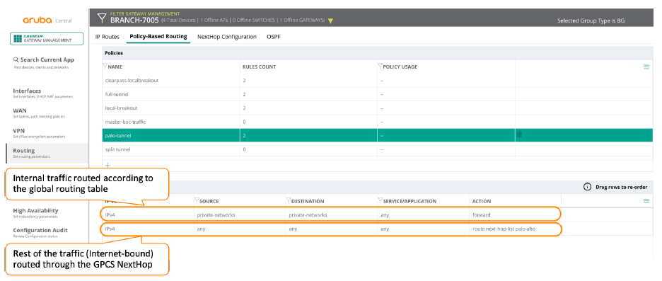 Add the next hop to a routing policy by selecting RoutingPolicy-Based Routing.In the following example, the policy is sending all the traffic to private subnets (an alias representing 10.0.0.0/8 and 172.16.0.0/12) through the regular path, and it’s sending the rest of the traffic through the Prisma Access nodes.