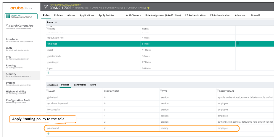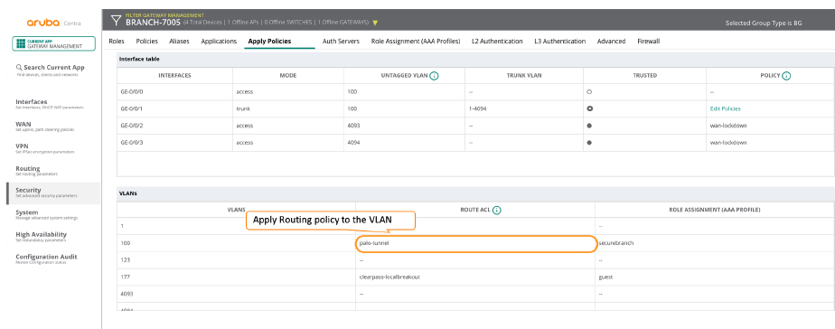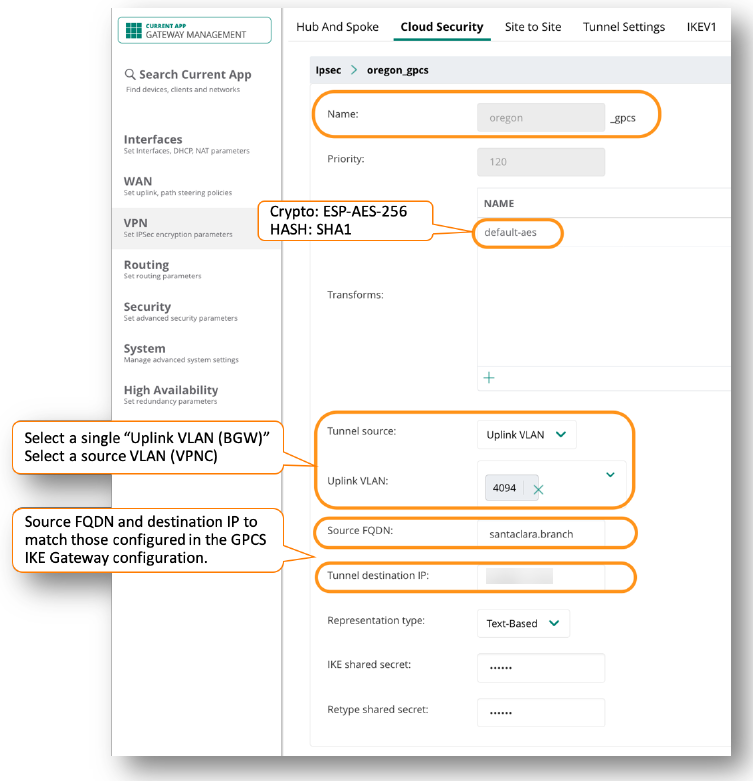 The configuration required for the BGWs is straightforward and can apply Aruba Central’s group-based configuration to reuse as much configuration as possible across branches.- In the Aruba Branch Gateway, set up the tunnel to Prisma Access.