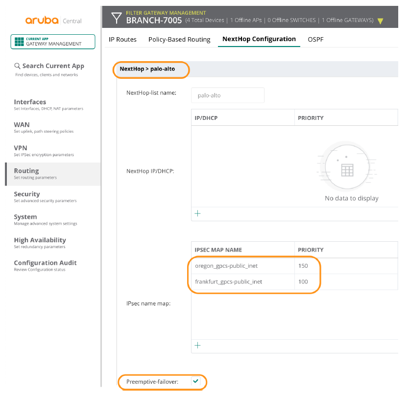 Create one or more next-hop lists with the tunnels.After you create the tunnels, next-hop lists group them together to be used inside PBR policy rules.- Select NextHop ConfigurationRouting.Create a NextHop.Add Site-to-Site IPSec maps.Enter different priorities for the different tunnels.Prisma Access does not support load-balancing.Select Preemptive-failover.