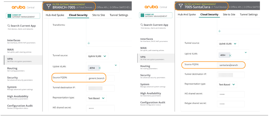 Even though the source FQDN has to be unique on a per-branch basis, you should configure the remaining parts of the tunnel configuration at the group level whenever possible. This hierarchical configuration model greatly streamlines configuration efforts. The following screenshot shows a specific Source FQDN configured for the local configuration and a generic Source FQDN specified for the group-level configuration.
