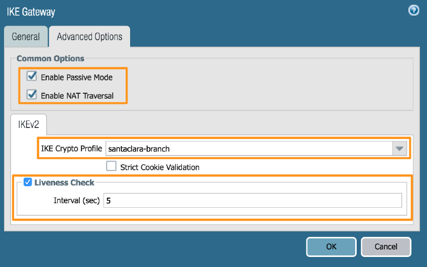 - In the Advanced Options tab, enter the fields as shown in the following screenshot. Be sure to specify the IKE Crypto Profile you created in step 1