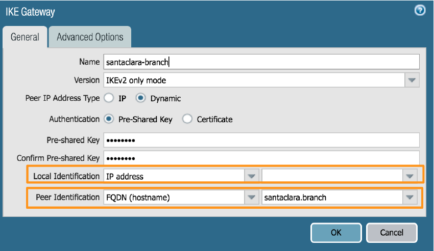 - In the General tab, leave the Local Identification IP address blank, because you don't know what this address is at the time of configuration. You can, however, enter in the Peer Identificaiton of a type of FQDN (hostname) and enter the FQDN of the BGW.