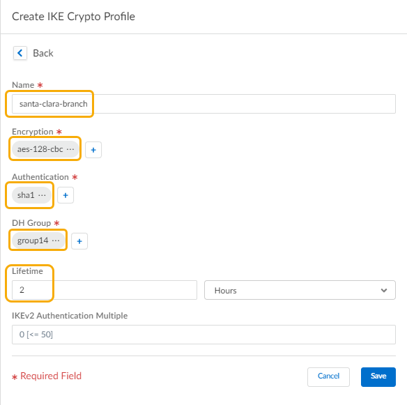 Select IPSec Advanced Options and Create New to create a new IPSec Crypto profile for the remote network tunnel using the recommended settings.Select IKE Advanced Options and Create New to create a new IKE cryptographic profile for the remote network tunnel.Be sure to use the crypto values that are supported with Aruba and make a note of the values you use.