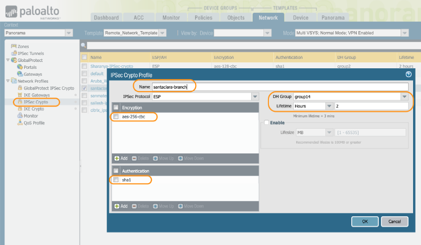 - Select NetworkNetwork ProfilesIPSec Crypto.Add a new IPSec Crypto profile using the following recommended settings: