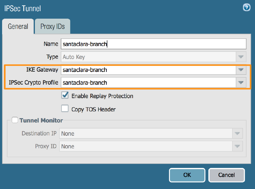 Create an IPSec tunnel configuration.After you create the IKE gateway, you can apply it to the IPSec tunnel you create.- Select NetworkIPSec Tunnels.Add a new IPSec tunnel.In the General tab, specify the IKE Gateway and IPSec Crypto Profile you created in earlier steps.