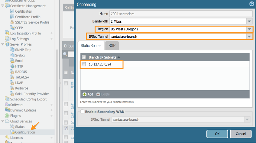 - If a secondary gateway is in place in the branch, specify this secondary gateway as a secondary by selecting Enable Secondary WAN and selecting the tunnel between the secondary BGW andPrisma Access.