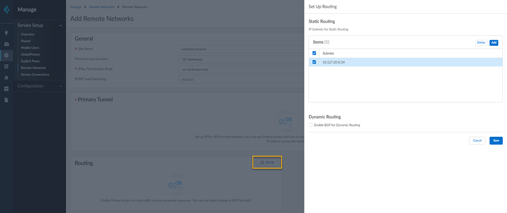 Set up routing for the remote network.Set Up Routing and Add the IP subnets for Static Routing.
