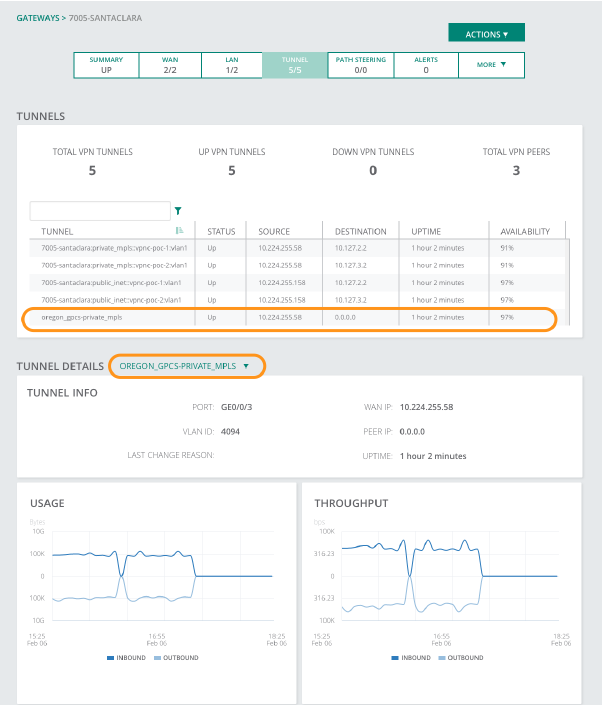 To verify the status of the remote network tunnel, perform one or more of the following steps.- Check the state of the tunnel from the interface of Aruba Central from the gateway monitoring page, in the tunnels section: