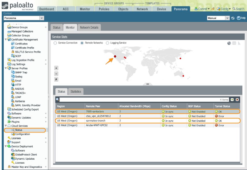 - Check the state of the tunnel from Prisma Access by selecting PanoramaCloud ServicesStatusMonitorRemote Networks.