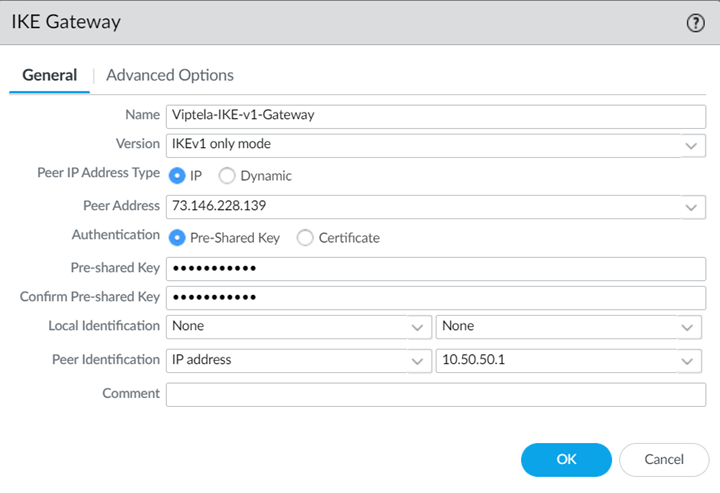 Select Network ProfilesIKE Gateways and Add an IKE Gateway.- Specify the following values in the General tab: