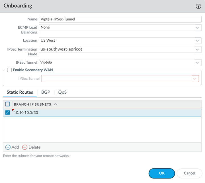 - Specify a Branch IP Subnet that is significant to Cisco Catalyst.A /30 subnet is sufficient for a Cisco Catalyst-Prisma Access SD-WAN integration, because you need only two IP addresses for this configuration: