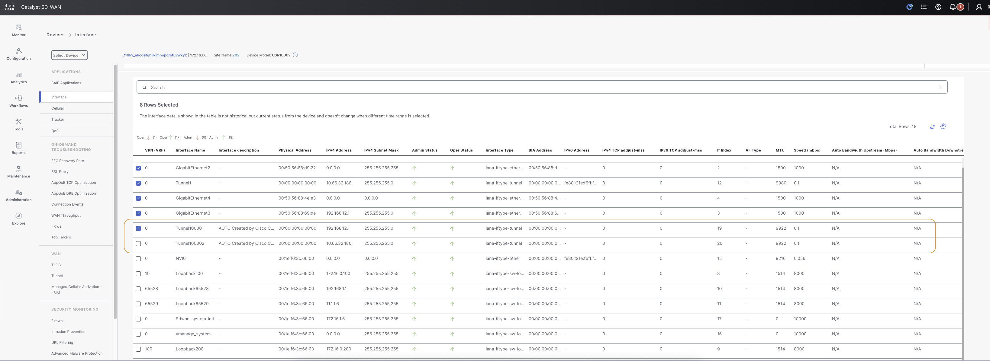To avoid dummy values on other devices, move the devices, for those you want to enable connectivity, to a separate device template and enable the connectivity for each device in this device template. If you enable devices with dummy values, Prisma Access overwrites those dummy values with the tunnel configuration values. Prisma Access populates dummy values for the description, tunnel source interface, tunnel destination, pre-shared secret, and IKE local ID.If you add a new device to the device template that has a SIG, configure a few dummy values and attach the device to the device template. After the integration discovers this device, enable it.Verify the tunnel status in Cisco Catalyst SD-WAN Manager.Log in to the Cisco SD-WAN dashboard, and select MonitorDevices. Select the device and view the Interface. Verify the admin status and operational status of the tunnel that was auto created for this device.