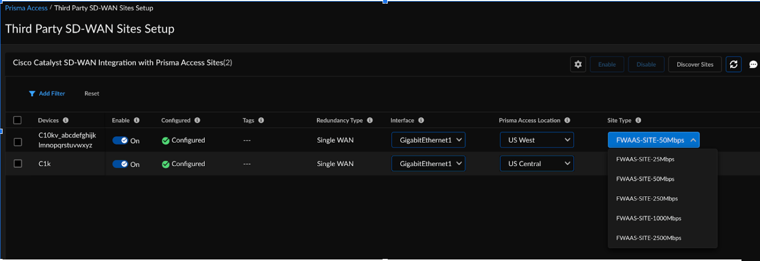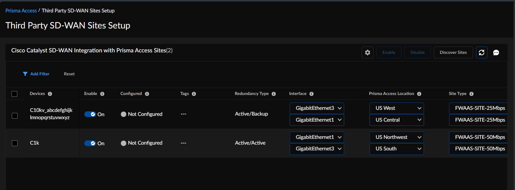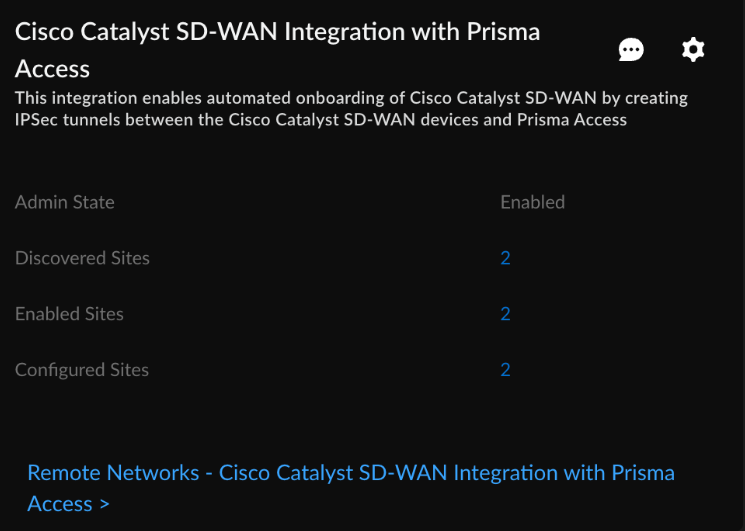 When you click a site count, the hyperlink takes you to a filtered list of sites based on the site count you click. For example, if you click the site count of enabled sites, the list shows only the sites that are enabled and not all discovered sites.Verify the changes in Prisma Access.- Go to System SettingsIntegrationsThird Party SD-WANRemote Networks - Cisco Catalyst Integration with Prisma Access.In the Branch Sites Management screen, you can view the number of site licenses purchased and allocated and verify the tunnel status for sites where the Config Status of Cisco Catalyst networks shows configured.The integration creates remote networks automatically. Such remote networks have names in the following syntax: AUTO-CATALYST-Device_Name.