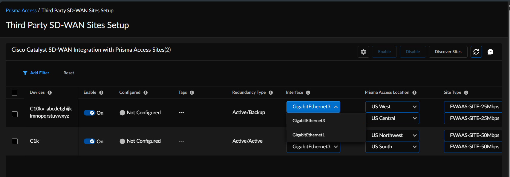 If there are multiple devices that are part of a device template, configure all devices for tunnel formation with Prisma Access.Check the running configuration for the interfaces.In Cisco vManage, select Configuration Devices WAN Edge List.