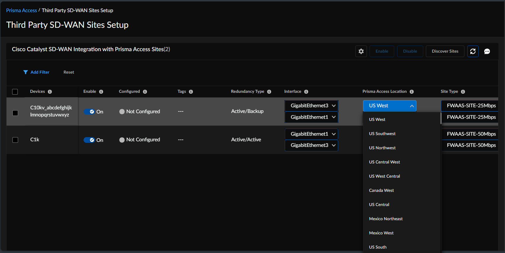 - Enabled: Enables the integration to discover new devices on Cisco Catalyst SD-WAN that are eligible for tunnel formation with Prisma Access. Additionally, this verifies current configurations.