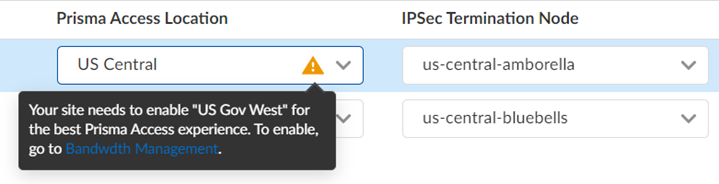The integration assigns Prisma Access location and IPSec termination nodes automatically. However, you can choose other Prisma Access locations or IPSec termination nodes if needed.