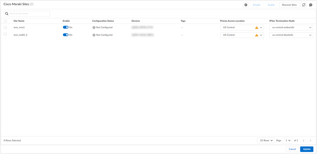 After you save the changes, you can see the Cisco Meraki networks eligible for tunnel formation with Prisma Access in Discovered Sites. Cisco Meraki networks are displayed as sites here. It might take some time to view the discovered sites.