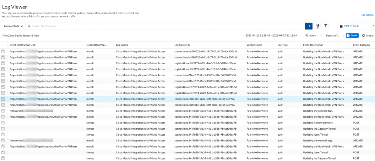 The Destination Vendor specifies if the changes were made in Prisma Access or in the Cisco Meraki dashboard.