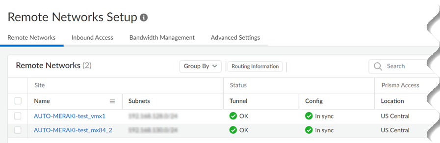 Verify the tunnel status. The integration creates remote networks automatically. Such remote networks have names in the following syntax: AUTO-Meraki-Network_Name