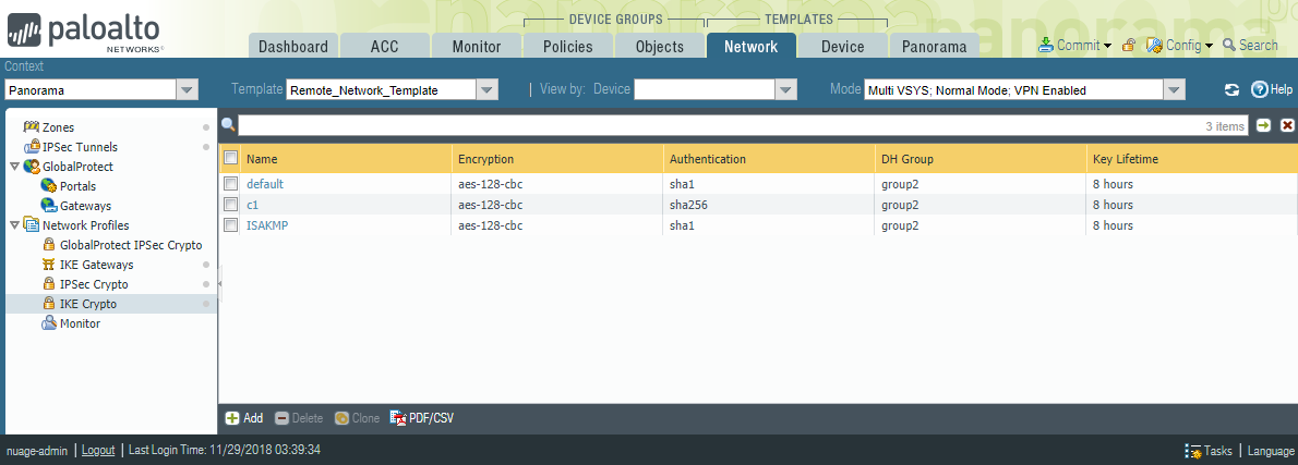Select IPSec Advanced Options and Create New to create a new IPSec crypto profile for the remote network tunnel using the recommended settings.Make sure you use IPSec crypto settings that are supported with Prisma Access and Nuage Networks SD-WANSelect IKE Advanced Options and Create New to create a new IKE cryptographic profile for the remote network tunnel.Make sure you enable IKE NAT Traversal. The Nuage Network Services Gateway (NSG) initiates the IKE negotiation, and allows the negotiation to occur even if Nuage Networks side is behind NAT. Refer to the IKE crypto settings that are supported with Nuage for the rest of the settings and make a note of the values you use.Save the tunnel configuration.Push your configuration changes.- Return to ConfigurationNGFW and Prisma AccessConfiguration ScopePrisma AccessRemote Networks and select Push ConfigPush.