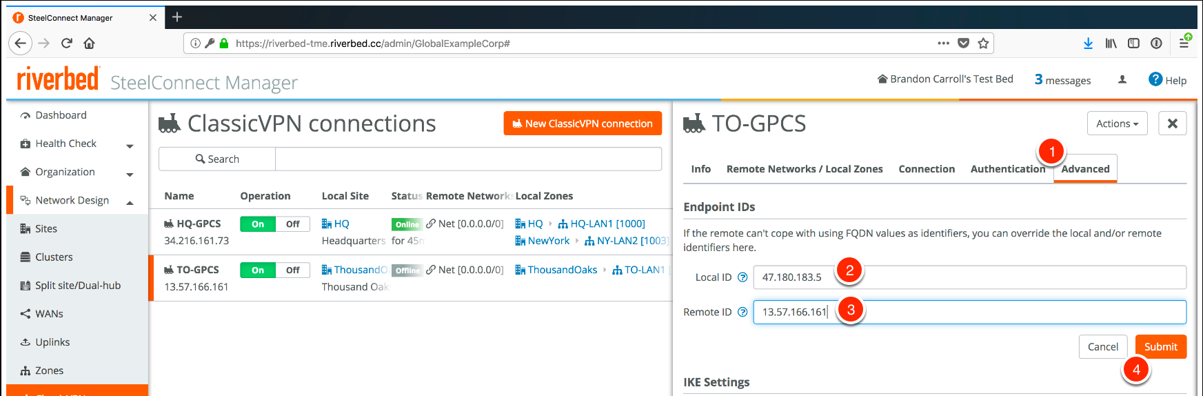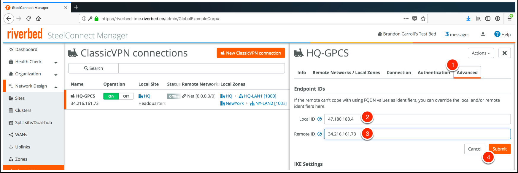 (Optional) Modify the Local ID, if required, by completing the following steps:- Click Advanced.Enter the Local ID.Enter the Remote ID.Click Submit.There are now three established ClassicVPN sessions from each site to Prisma Access.