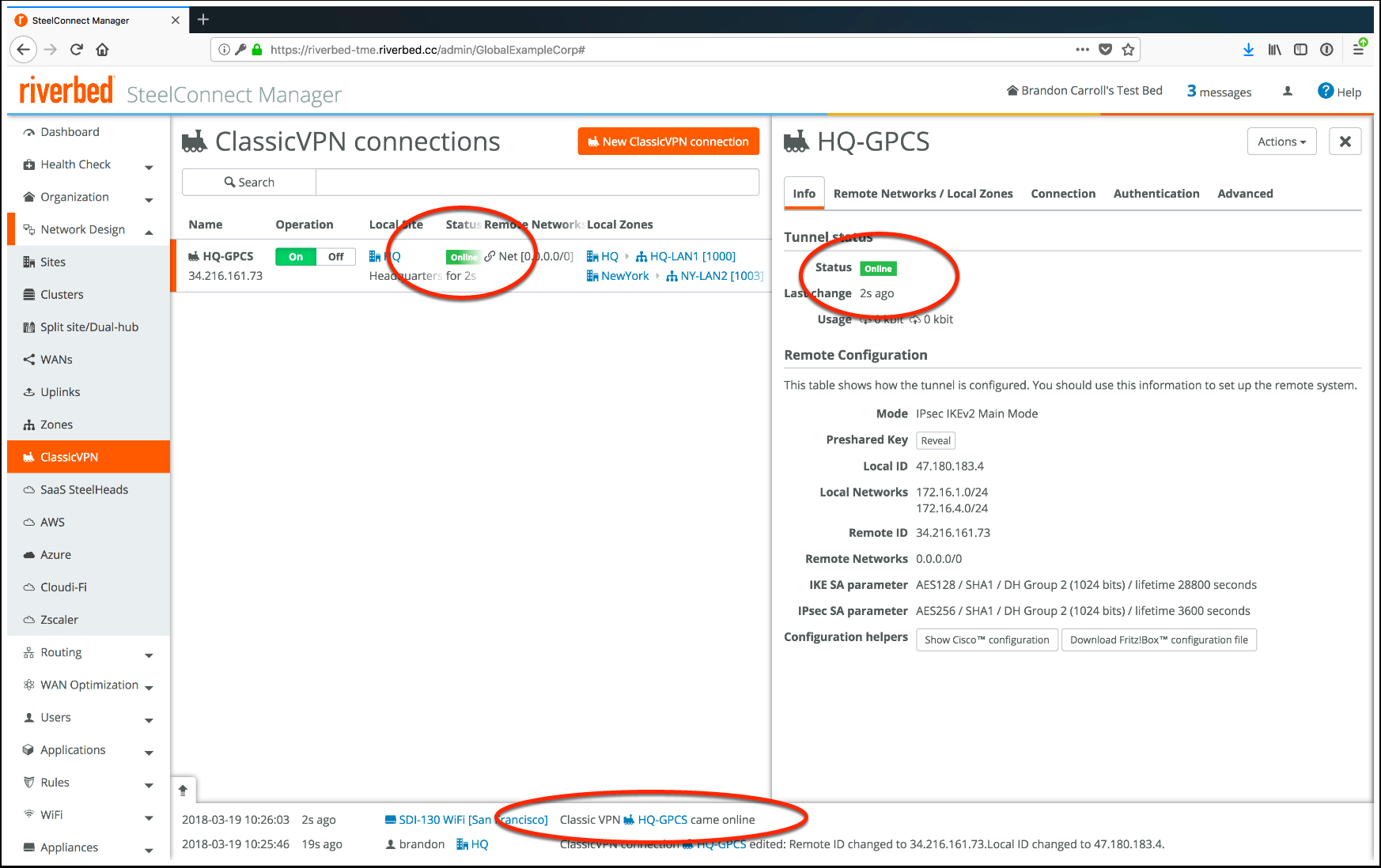 Enter the Remote ID.The remote ID is the tunnel endpoint IP address in Prisma Access.Click Submit.Configure IKE settings (Phase 1) and IPSec (Phase 2) encryption settings by completing the following steps.IPSec VPNs establish in two phases, IKE phase 1 and IPSec phase 2. Phase 1 is used to create a secure channel in which parameters that apply to the data being encrypted are negotiated. In SCM, the IKE settings are for the phase 1 tunnel. The phase 2 tunnel negotiation defines how the user traffic is encrypted from the SteelConnect gateway to Prisma Access.The example used in this workflow creates an IKE tunnel with AES128 encryption, SHA1 hashing, and a lifetime of 28,800 seconds (8 hours).- Scroll down in the Advanced tab and select IKEv1.IKEv1 uses the phase 1 and phase 2 method of negotiation, while IKEv2 creates parent and child security associations.Select AES128.Select SHA1.Enter 28800 in the IKE lifetime field.This setting specifies the length of time that the IKE phase 1 tunnel remains up before it renegotiates.Select AES256 as the IPSec encryption cipher. Select SHA1 in the IPSec has algorithm field.Select DH Group 2 (1024 bit) in the IPSec DH Group field.Enter an IPSec lifetime of 2600 seconds.Click Submit.After submitting this configuration, the tunnel begins to establish. Once the tunnel establishes, you receive an event notification in SCM and the tunnel status displays as Online, as seen in the following figure.