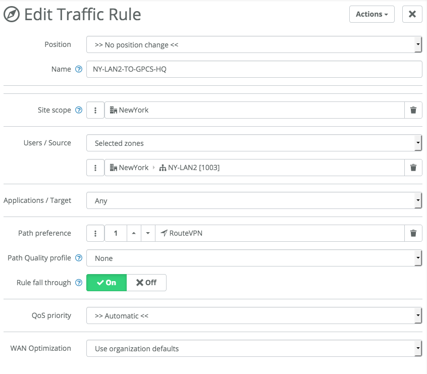 Edit the traffic rule so that the tunnel the NY-LAN2 and HQ-LAN1 uses the MPLS tunnel by default.This configuration ensures that traffic from the NY site to the internet is first backhauled to HQ using the MPLS connection.